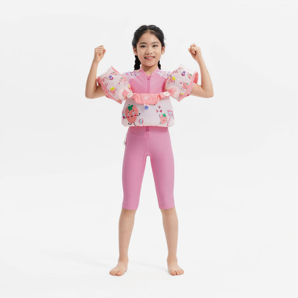Selon le niveau d’activité de votre enfant et la durée des séances aquatiques, les aides à la flottabilité portées peuvent générer des frottements. Pour prévenir cet inconfort nous préconisons le port d’un top en dessous du brassard évolutif Tiswim.