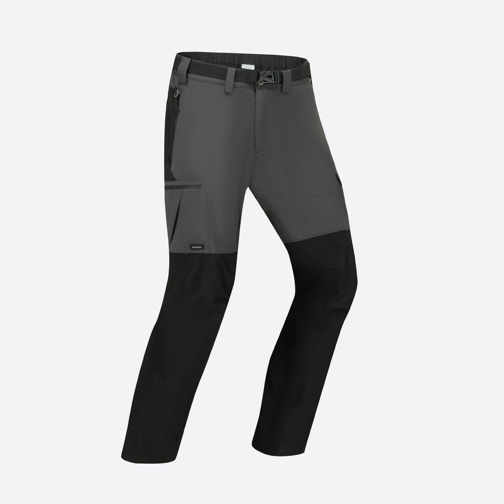 Le pantalon de trek MT500 est équipé de : - 2 poches main zippées ; - 1 poche cuisse droite zippée comportant 1 compartiment téléphone à l'intérieur ; - 1 poche cuisse gauche avec rabat ; - 1 poche arrière zippée. Un système de serrage élastique en bas de jambe permet un ajustement parfait du pantalon sur la chaussure. Le pantalon est vendu avec une ceinture.